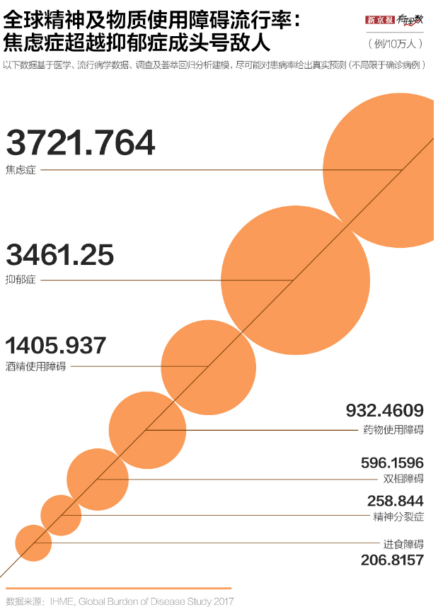 从全球范围看,焦虑症的普遍程度,已经超过了人们熟知的抑郁症,成为人类精神健康的头号敌人。全球疾病负担研究(Global Burden of Disease Study)的数据显示,2017年,全球焦虑症的患病率为3721.764例/10万人,在精神障碍类问题里患病率居首位。