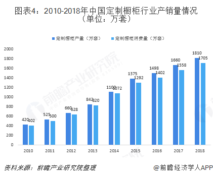 在政策以及其他技术的因素影响下,近几年我国定制橱柜行业生产企业生产能力大幅提高,居民生活水平提高,个性化需求增加,定制橱柜行业产销两旺。2018年我国定制橱柜行业产量约1810万套,同比2017年的1660万套增长了9.04%;市场消费量约1705万套,同比2017年的1558万套增长了9.44%,