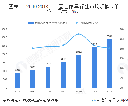 得益于家具行业稳定增长态势以及信息化、自动化水平的不断提高,定制家具行业拥有良好的生存以及成长环境。随着居民收入水平和文化水平的提高,以及对居住环境和品质的逐步重视,不同消费群体对家居用品的个性化、智能化、健康化和功能化的追求日益增加,带动定制家具需求增长,为定制家居提供有力支撑。定制家具凭借对家居空间的高效利用、兼顾实用性,能充分体现消费者的舒适、时尚、个性消费需要、现代感强等特点,市场地位不断提高,成为近年来家具消费领域中新的快速增长点。近年来,定制家具行业已步入快速成长的发展阶段。2018年,定制家具市场规模约为2901亿元,较上年同比增长20.22%;近7年来,定制家具市场规模增速始终保持在20%以上。