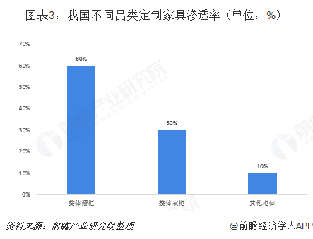 分品类来看,由于发展时间、市场接受度不同,渗透率有 所差异,其中起步较早的整体橱柜行业。橱柜行业在初期提供的是成品橱柜,近几年消费者个性化定制的需求催生了定制橱柜的产生,市场上的品牌竞争就由过去的传统成品橱柜品牌市场竞争演变成了在的成品橱柜和定制橱柜的品牌竞争,定制橱柜越来受到消费者青睐,成品橱柜的市场在不断被压缩。目前定制橱柜渗透率在60%左右;定制衣柜近几年随着市场认可度的快速提升,渗透率目前达到 30%左右;而其他柜体目前尚处于导入期,渗透率不足10%。
