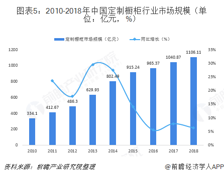 我国定制橱柜行业保持持续稳定增长的态势,由2010年的334.1亿元增至2018年的1106.11亿元。年均复合增长率超过18%。行业成长速度高于家装市场整体。