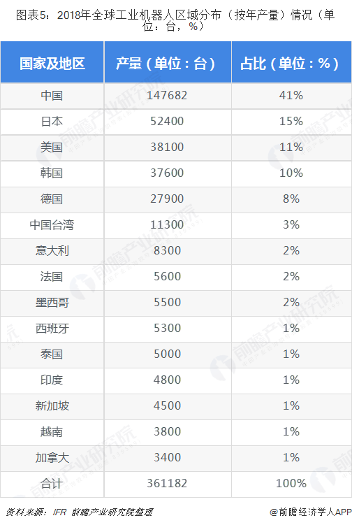 从全球工业机器人的年安装量变化情况来看,据IFR的统计,2018年中国产量提升到147682台,北美、日本、韩国和德国的安装量比重略有下滑。整体来看,2018年亚太地区依然是工业机器人产量增量最大的市场。