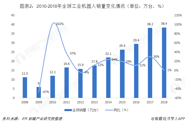 自2010年以来,随着自动化技术的发展以及工业机器人技术的不断创新,全球对工业机器人的需求已明显加快。2012-2017年,全球机器人销量年均复合增长率(CAGR)约为19%,与以往相比,工业机器人的销量从未如此大幅度地增加过。2005-2008年,全球机器人年平均销量约为11.5万台,然而2009年因为金融危机导致机器人销量大幅下滑。2010年,在2009年受到限制的投资成为机器人销量增加的主要驱动因素。2011-2017年,全球年平均销量增加至23.6万台,约是2005-2008年的年平均销量的2倍。2015-2017年,全球机器人年平均销量增加至约31万台,这是全球工业机器人需求显著增加的标志。根据IFR(国际机器人联合会)发布的最新报告,2018年全球工业机器人销量继续保持高速增长,达到38.4万台,同比增长1%。