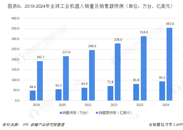 前瞻产业研究院分析认为,工业大国提出机器人产业政策,如德国工业4.0、日本机器人新战略、美国先进制造伙伴计划、中国大陆十三五规划与《中国制造2025》等国家级政策,皆纳入机器人产业发展为重要内涵,将促使工业机器人市场持续增长,IFR预计到2024年全球工业机器人产量将达到85万台,销售额达到355.0亿美元。