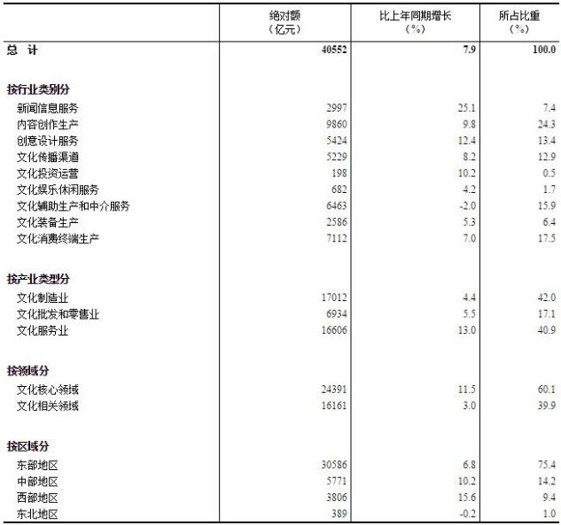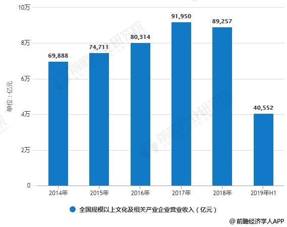 2019年年上半年,全国文化产业继续保持平稳较快增长。7月31日,国家统计局发布数据显示,2019年上半年全国规模以上文化及相关产业企业营业收入40552亿元,比上年同期增长7.9%。