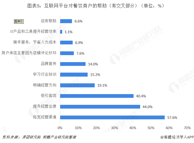 从使用互联网餐饮平台的餐饮商户经营者的认可度来看,大部分餐饮商户都认为互联网餐饮平台对自身经营有帮助。其中,认为美团点评等互联网餐饮服务平台对拓宽经营渠道有提高的餐饮商户占比57.6%,认为其对经营业绩有帮助的商户占比44%,认为其吸引了大量客流的商户占比40.4%。