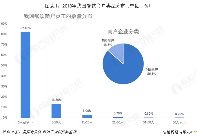 经过多年的发展,我国餐饮业始终保持快速增长态势,催生了我国庞大的餐饮商户体量。据美团研究院调查数据显示,2018年我国有85.2%的餐饮商户为个体店,13.5%的餐饮商户为连锁商户;95.9%的餐饮商户的员工数量在10人以下。综合分析得出,我国餐饮商户数量较多,但大都以中小微企业为主,个体商户居多,连锁化和集中化程度比较低,呈现出大体量、小规模的特征。