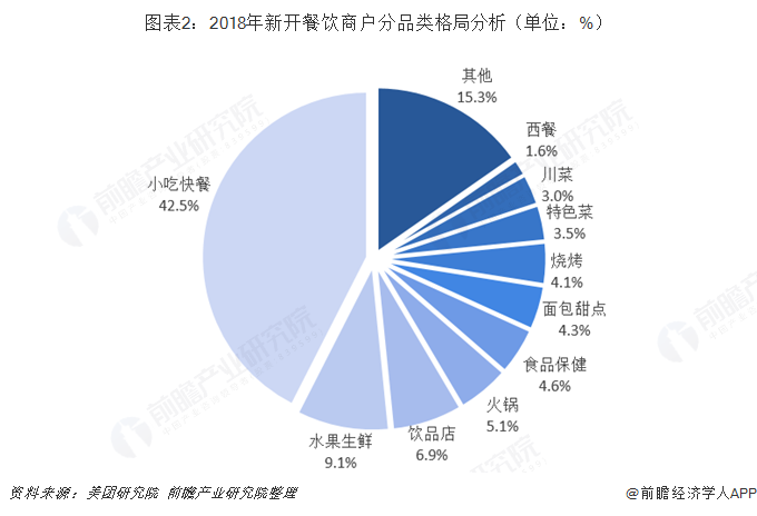 从我国2018年新开业的餐饮商户来看,小吃快餐类最多,成为餐饮商户的首选创业品类,占比高达42.5%,其后分别是水果生鲜,占比为9.1%、饮品店占比6.9%、火锅类占比5.1%、食品保健占比4.6%。前瞻产业研究院认为发生这一现象的原因在于我国8090后人群体量逐渐庞大起来,且单身人群也越来越庞大,而小吃快餐类作为这一群体日常生活的习惯性消费品,因此被市场广为追捧。