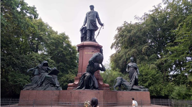 公园里,古树参天,繁花似锦,绿树成荫,但游人稀少。在公园中心,见到一幢草房,人们都在这里休闲、漫饮。我想起成都的草堂,想起杜甫的诗:茅屋为秋风所破歌,真是东西相应,有点诗情画意。在公园北侧,见到一座1901年雕塑,让我最感兴趣的是一位德国男人,头顶地球,双脚箭地,两眼有神,向着远方。含义深刻,彰显日耳曼民族的个性和斗志。
