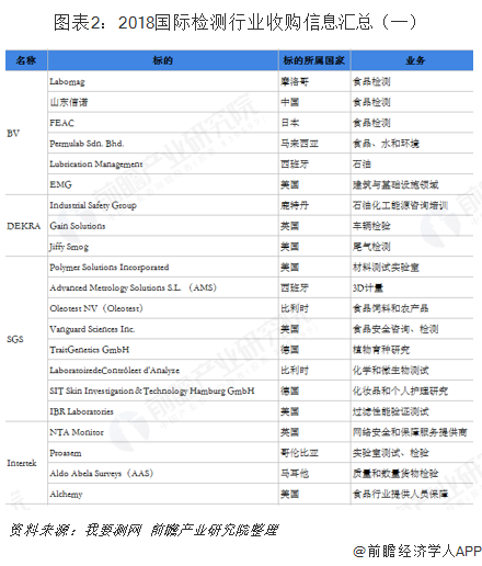 TIC行业的高度碎片化形成了众多千万美元级别的细分市场龙头,并购整合是增加市场份额的主要方式,2018年,TIC行业的并购市场仍如火如荼。SGS全年完成8笔收购,收购为集团创造了营业收入和运营利润,扩大了集团在农产、食品、消费品和零售、交通、工业等领域的服务能力和足迹;BV完成了6次收购;DEKRA全年共完成3起收购活动;Eurofins全年共完成约50起收购活动,代表年收入约7.2亿欧元,总投资额约12亿欧元;Intertek在2018年进行了4项收购,均是具备核心知识产权和市场领先地位的企业。