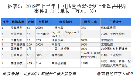 据不完全统计,2019年上半年国内上市检测机构共发生7起投资收购事件。其中,交易金额最大的是苏州建研院以2.91亿元收购上海中测行工程检测咨询有限公司。此外,中国力鸿发生海外收购,收购新加坡一家石油天然气检测公司,布局新加坡市场。经整理发现,除收购检测业务相关的机构之外,国检集团、祥源科技均收购、入股投资机构;格林检测被投资机构揽入囊中,可见检测机构与投资机构愈加融合发展,检测行业也将会更多的引入和借助资本力量来助力发展。