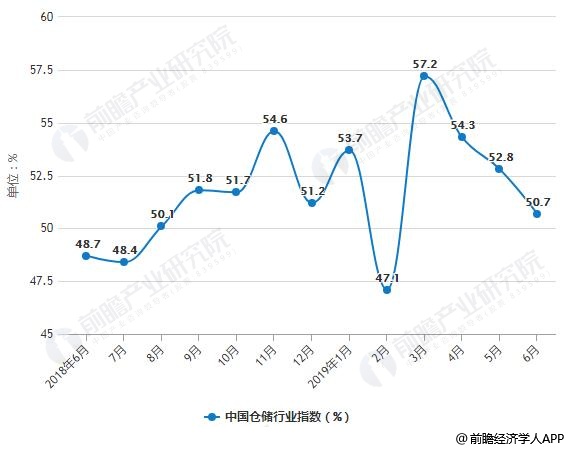 随着物流行业的发展,仓储业作为重要的组成部分也得到了良好发展。根据物流与采购联合会数据显示,2018年6月到2019年6月的一年时间中,我国仓储行业指数整体处在景气区间,行业发展较好。2019年6月中国仓储行业指数为50.7%,较5月回落2.1个百分点。虽然指数连续四个月回落,但仍位于扩张区间,新订单、业务量、业务预期指数均位于较高水平,表明仓储行业整体运行态势仍保持向好,只是增速较前期有所放缓。