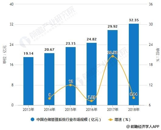 据前瞻产业研究院发布的《中国仓储管理系统(WMS)行业市场前瞻与投资战略规划分析报告》统计数据显示,目前来看,我国仓储物流企业全部基本实现企业仓储管理系统覆盖,其余单位的仓储管理系统的渗透率在20%左右,按照每套仓储管理系统6万元的价格标准,经测算,2013-2018年我国仓储管理系统行业规模不断增加。2013年中国仓储管理系统行业市场规模已达19.14亿元,截止至2018年我国仓储管理系统行业市场规模较上年有明显的增加,达到32.35亿元,同比增长8.14%。