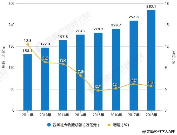 随着我国工业进程的不断加快,大宗商品运输和工业生产原材料及半成品的运输需求稳步提升,我国物流行业稳中向好。2011-2018年,全国社会物流总额不断提高。根据中国物流与采购联合会数据显示,截止至2018年底,全国全社会物流总额达到了283.1万亿元,按可比价格计算,同比增长6.4%。其中,工业品物流总额256.8万亿元,增长6.2%;进出口货物物流总额14.1万亿元,同比增长3.7%,受中美贸易摩擦和进出口物流成本降低的影响,增速回落5个百分点;农产品物流总额3.9万亿元,同比增长3.5%;单位与居民物品物流总额7万亿元,同比增长22.8%。