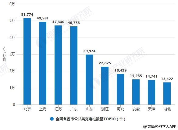 在中国电动汽车充电基础设施促进联盟数据排名中,公共充电桩数量排名前10位的省市分别是北京、上海、江苏、广东、山东、浙江、河北、安徽、天津和湖北。