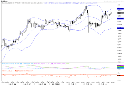 受到美国国债收益率倒挂引发避险情绪影响,昨日黄金回升15美元,从周二最低的1479.5美元反弹至现在1520美元一线。
