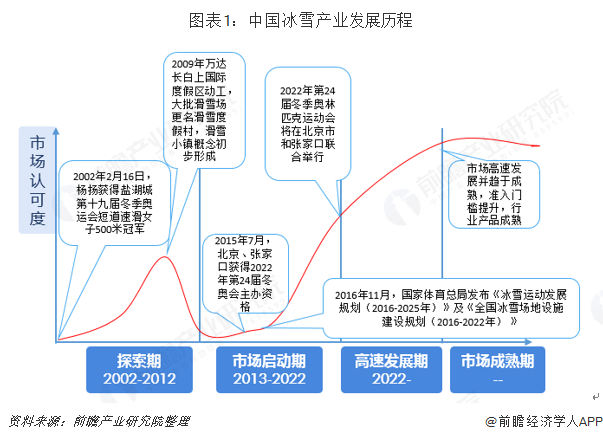 21世纪以前,我国冰雪产业处于粗犷发展阶段,各地区各自为政,冰雪产业并没有形成完整的产业体系。自2002年2月16日,杨扬获得盐湖城第十九届冬季奥运会短道速滑女子500米冠军,冰雪产业开始有了一定的市场认可度,我国冰雪产业进入了发展探索期;2015年7月,北京、张家口获得2022年第24届冬奥会主办资格为我国冰雪产业发展提供了重大机遇,国家层面开始重视我国冰雪产业的发展和规模效应,一系列的政策出台使冰雪产业正式进入市场化发展,根据国家规划,我国冰雪产业在2022年将进入高速发展期,未来市场前景十分乐观。