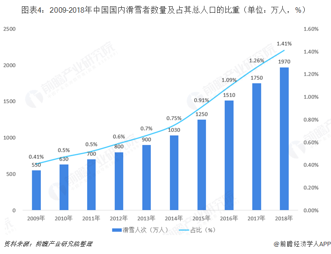 随着我国冰雪产业资源的不断完善,越来越多的消费者也对冰雪旅游、冰雪运动、冰雪文化、冰雪培训等内容产生了兴趣。以滑雪运动为例,2018年,我国滑雪运动人次数增长至1970万,保持10%以上的较高速度增长,2009-2018年,国内滑雪者数量占总人口比重呈现出逐年上升的趋势,2018年滑雪人数占比总人口数为1.41%。虽然我国滑雪人数增长较快,但对标发达国家,我国滑雪运动所占总人口比重依旧较低,国内滑雪市场空间巨大。