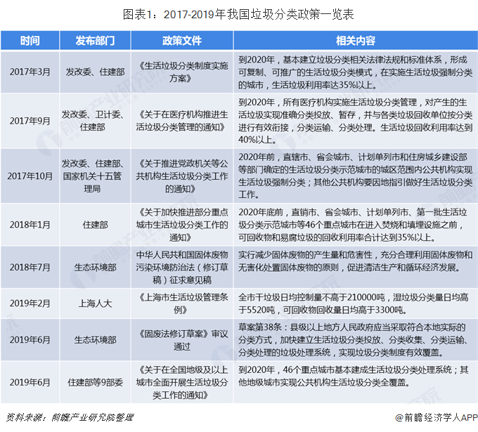 从2016年开始,多省市相继出台了生活垃圾分类政策和实施方案。《生活垃圾分类制度实施方案》的发布,要求在全国46个城市先行实施生活垃圾强制分类,2020年底生活垃圾回收利用率达35%以上。
