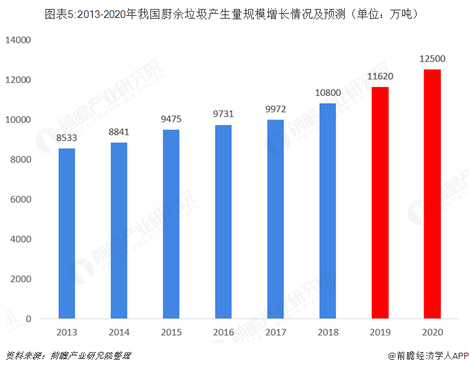 另外根据发改委发布的《“十三五”全国城镇生活垃圾无害化处理设施建设规划》。到“十三五”末,全国力争新增餐厨垃圾处理能力3.44万吨/日,“十三五”全国餐厨垃圾处理设施建设投资为183.5亿元。可推算出平均餐厨垃圾工程单位投资约为53.3万元/吨。如果就整个行业的发展空间而言,到2020年,餐厨垃圾产生量预计将达到12500万吨,即34万吨/天,若实际处理能力能满足每天的产生量,则前瞻产业研究院预测“十三五”期间整个餐厨垃圾处理设施投资市场规模将达1812亿元。