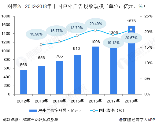 随着互联网线上流量增长的乏力,巨头们线下布局战略正深入下沉、推进,户外或将成为未来最大的流量入口。在这样的趋势之下,中国户外广告市场规模呈现了较快增长。2018年,我国户外广告市场投放额为1576亿元,同比增长20.67%。