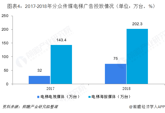 以电梯广告市场为例,分众传媒作为电梯广告市场龙头企业,2018年,分众传媒电梯电视媒体投放量约为75万台,同比增长134.4%,电梯海报媒体投放量为202.3万台,同比增长41.1%,其广告业务覆盖300多个城市。