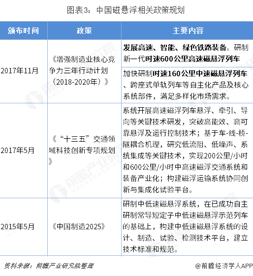 目前,国内关于城市磁悬浮行业的政策规划文件较少,国家层面的政策文件主要有3个,分别为《中国制造2025》、《“十三五”交通领域科技创新专项规划》及《增强制造业核心竞争力三年行动计划(2018-2020年)》。