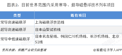目前,中低速磁悬浮列车普遍使用常导磁悬浮技术,其示范项目包括了日本名古屋线、韩国仁川机场线和长沙机场线、北京S1线。