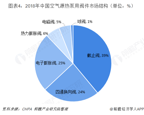 从具体产品来看,空气源热泵阀件的产品结构与商用空调用阀件较为一致,包括截止阀、四通换向阀、电子膨胀阀、热力膨胀阀、电磁阀与球阀。其中截止阀、四通换向阀、电子膨胀阀三大类产品需求量最大,分贝占比39%,24%,25%,合计占比接近90%。目前我国空气源热泵用阀件的生产企业中,国产品牌产品线较全,外资品牌则侧重于高附加值的产品。。