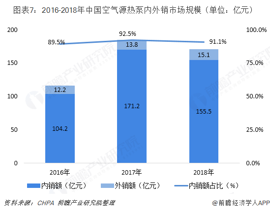 而从内外销角度来看,2018年,空气源热泵行业内外销需求变动存在差异化,其中国内销售额规模为155.5亿元,同比下滑9.2%;而出口额为15.1亿元,同比增长了9.4%。