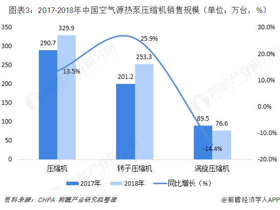 空气源热泵的核心零部件为压缩机,压缩机产品的成本约占整机产品成本的1/3-1/2。目前,提供压缩机产品的主要企业有艾默生、丹佛斯、松下万宝、三菱、海立、美芝等。根据节能协会热泵专业委员会(CHPA)数据显示,2018年,我国空气源热泵压缩机总销售量为329.9万台,同比增长13.5%,其中转子式热泵压缩机销售253.3万台,涡旋式热泵压缩机销售量76.6万台。由于河南、河北、山东等多地煤改电低补贴地区的大力支持,户式风机(采暖风机)兴起,带动了上游转子式热泵压缩机保持较高增速,达到了25.9%。而北京、天津地区煤改电规模缩减,户式水机大幅滑落,导致涡旋式热泵压缩机销量出现14.4%的下滑。