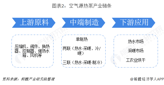 空气源热泵上游产品主要包括压缩机、阀件、储热水箱、铜管、水泵、换热器、控制器、风机、冷媒等,主要下游应用市场包括热水市场、采暖市场、工农业烘干市场等。在空气源热泵行业发展初期,大部分零部件都是借用已有传统产业供应链体系,如空调和热水器产业的产品供应链,随着行业规模的扩大,专用的零部件体系已陆续建立,重要零部件如压缩机、水箱、换热器、阀件、控制器和水泵等都开始有专业的供应商。