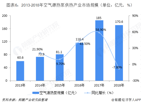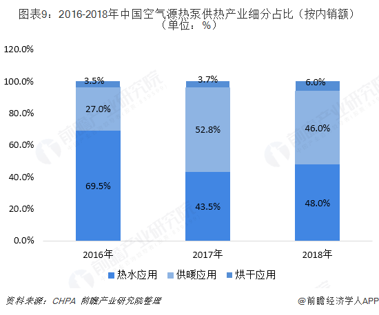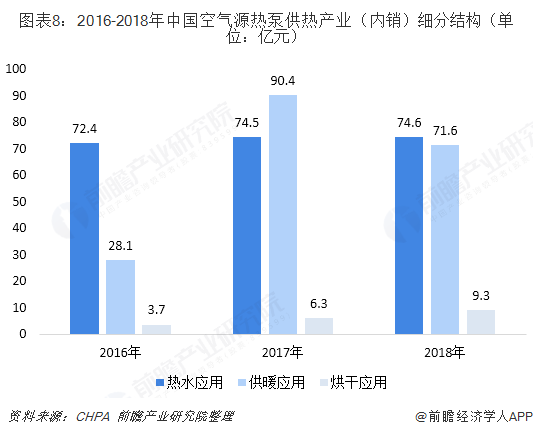 2018年空气源热泵行业销售规模为170.6亿元,同比下降7.6%,热水应用产品销售额为74.6亿元,与2017年基本持平;供暖应用产品销售额为71.6亿元,同比下滑20.8%;烘干应用产品销售额增长47.6%,达到9.3亿元。