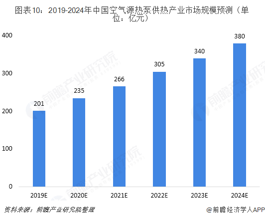 前瞻认为,空气源热泵行业未来发展潜力巨大,在生活热水、供暖和工农业烘干中的应用前景良好,未来5年空气能热泵行业将处于高速发展期,行业市场规模保持10%的增长速度,及至2024年达到380亿元。