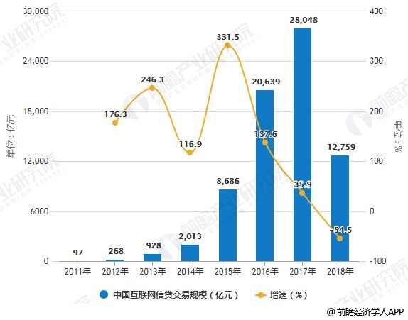 2011-2018年中国互联网信贷交易规模统计及增长情况