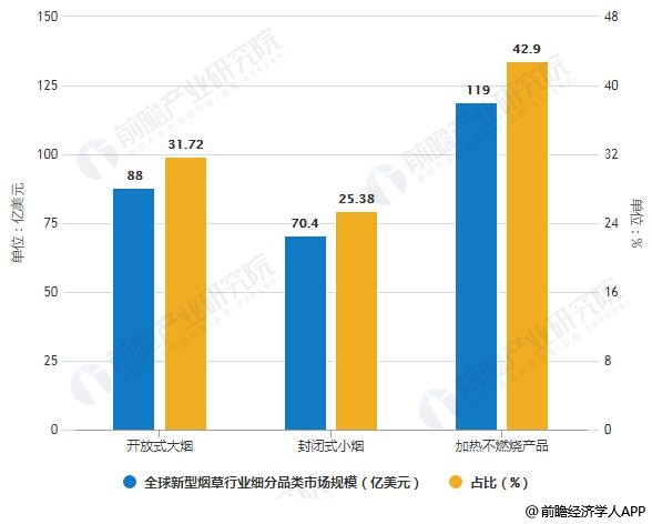 2018年全球新型烟草行业细分品类市场规模及占比统计情况
