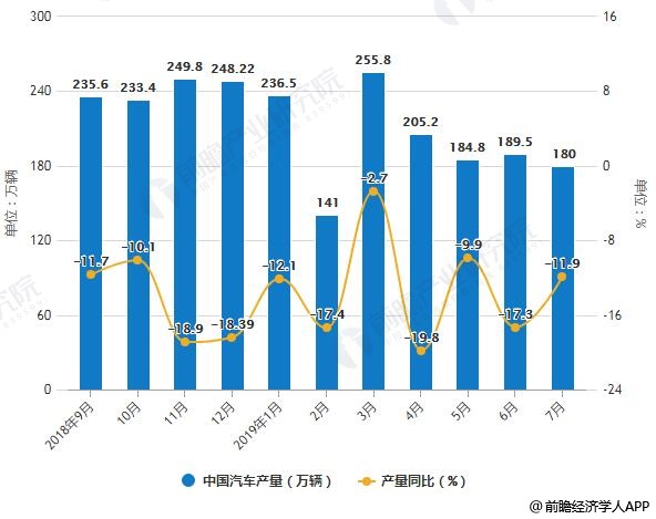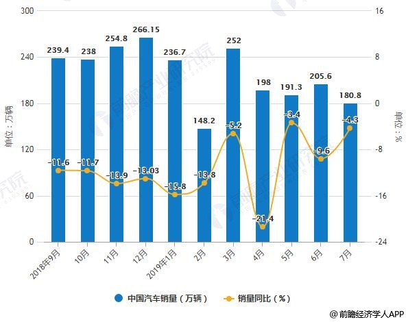 8月12日,中国汽车工业协会公布了中国乘用车市场最新产销数据。根据数据显示,2019年前7个月,中国汽车产销量分别达到1393.3万辆和1413.2万辆,同比下降13.5%和11.4%,市场仍处于低位运行的状态。2019年7月份,全国汽车产销量分别为180万辆和180.8万辆,同比下降11.9%和4.3%,7月汽车销量降幅有所收窄。