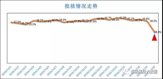 我们观察下图:某个产品2016年10月20日的走势情况,发现在10月20日这天,批核率有个比较大的下探。从数据分析的角度来看,应该有某个原因导致了批核的突然的走势。