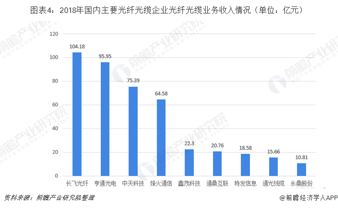 其中,长飞光纤已经成长为全球最大的光纤光缆企业,2018年光纤光缆业务收入超过100亿元,达到104.18亿元;处于第二阶梯的有亨通光电、中天科技以及烽火通信,光纤光缆业务收入在50-100亿之间;其余企业的光纤光缆业务收入相对较少。