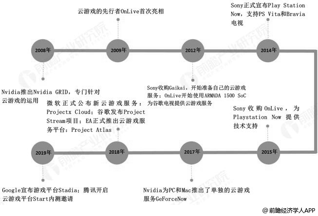 游戏产业内巨头已在云游戏领域探索十年,但带宽与时延始终是云游戏未能普及的技术瓶颈。2009年,Onlive首次亮相,云游戏进入大众视野,但由于当时美国平均家庭带宽只有9.54Mbps,这款产品因付费用户太少而终止; 2014年,Sony推出Play Station Now,该服务使得玩家能够通过帐号在PC上以“云串流”的方式体验游戏;2018年,微软、谷歌与EA等各大厂商开始布局云游戏,相继推出Project xCloud(微软)、Stadia(谷歌)和Project Atlas(EA)等云游戏服务平台。