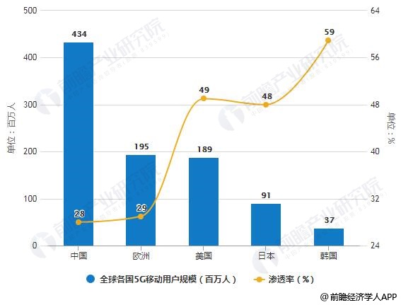 2025年全球各国5G移动用户规模及渗透率预测情况