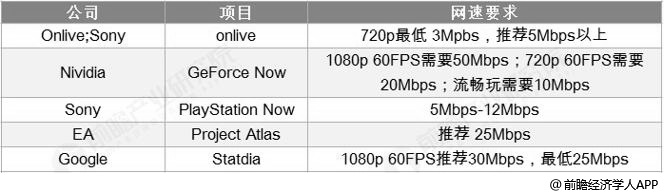 云游戏对网络的要求:谷歌Project Stream项目要求25Mbps带宽,延迟小于40ms;索尼PS NOW网速达到12Mbps才能流畅运行。现有的云游戏项目基本仅在少数网络设施好的国家/地区推广,比如PSNOW仅支持北美地区,Switch云版本游戏仅支持日服。