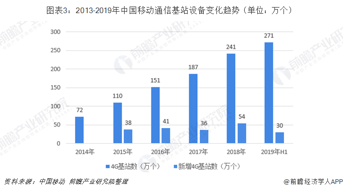 根据中国移动公布的2018年年报数据显示,截至2018年底,中国移动的4G基站数已达241万个,行政村网络覆盖率超过97.8%,有效应对了4G流量快速增长的需求,截止到2019年上半年,中国移动的4G基站数已达271万个,2019年新增30个。