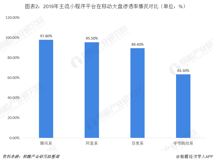 BAT作为老牌的互联网巨头,在小程序行业中也具有相当大的比较优势,由于小程序首先在微信端上线,先发优势为腾讯系带来了巨大的流量,加上用户对新兴事物的接受程度较高,对平台认可后较容易产生用户粘性。目前,微信小程序依然是用户规模最大的小程序平台,BAT三家巨头的去重用户规模均超10亿,且三大平台在移动用户中的渗透率均在85%以上,相较三大巨头,抖音以及字节跳动等其他小程序平台,还存在一定差距。