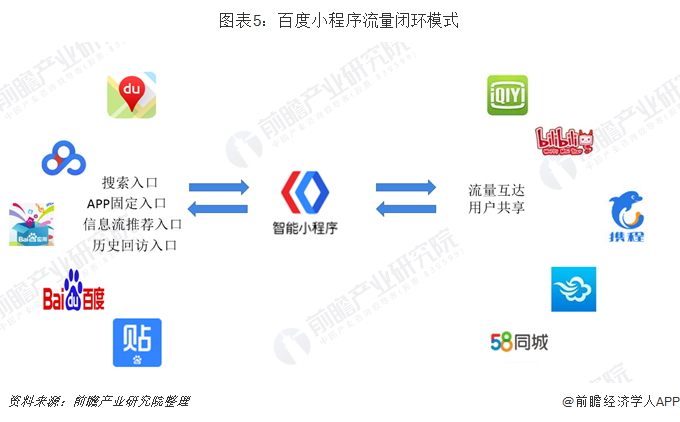 百度智能小程序打破了孤岛式流量流转,这也是百度作为搜索引擎类应用的特点,不局限于增加自身的流量,而是将流量分享给合作伙伴,实现流量全域触达,达成共赢的局面。用户不仅可以通过百度系产品中的搜索入口或固定入口进入智能小程序,还可以通过诸如58同城、爱奇艺、携程等APP触达小程序;同时百度小程序中的流量也会导入合作伙伴的APP中。