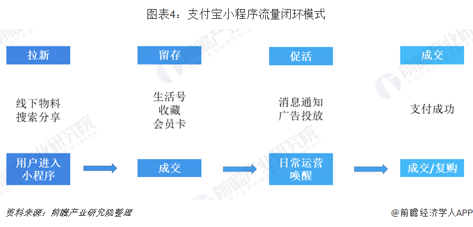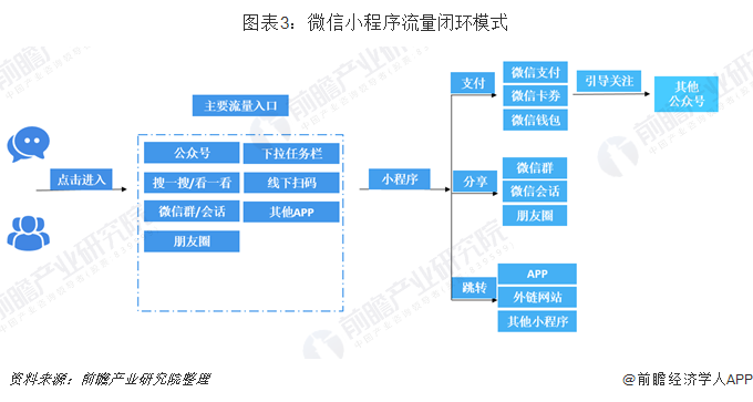 小程序作为争夺互联网流量的战场,其最终功能依旧是将互联网上的用户流量导入自家平台或者系列产品中。微信作为小程序功能的先发平台,在小程序应用中不断完善功能,目前已经形成较为成熟的流量闭环模式。用户从微信内部的会话窗口、公众号或外部APP等流量入口进入小程序,之后通过小程序的支付、分享、跳转等能力再次回到公众号、会话或外部APP,形成流量导入和应用的闭环模式。