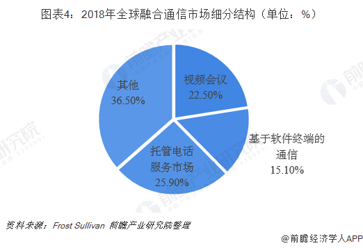 按细分领域划分,融合通信市场可分为视频会议、基于软件终端的通信、托管电话服务市场等。据Frost&Sullivan统计数据显示,2018年,全球视频会议占比22.5%,托管电话服务市场占比25.9%,基于软件终端的通信占比15.1%。