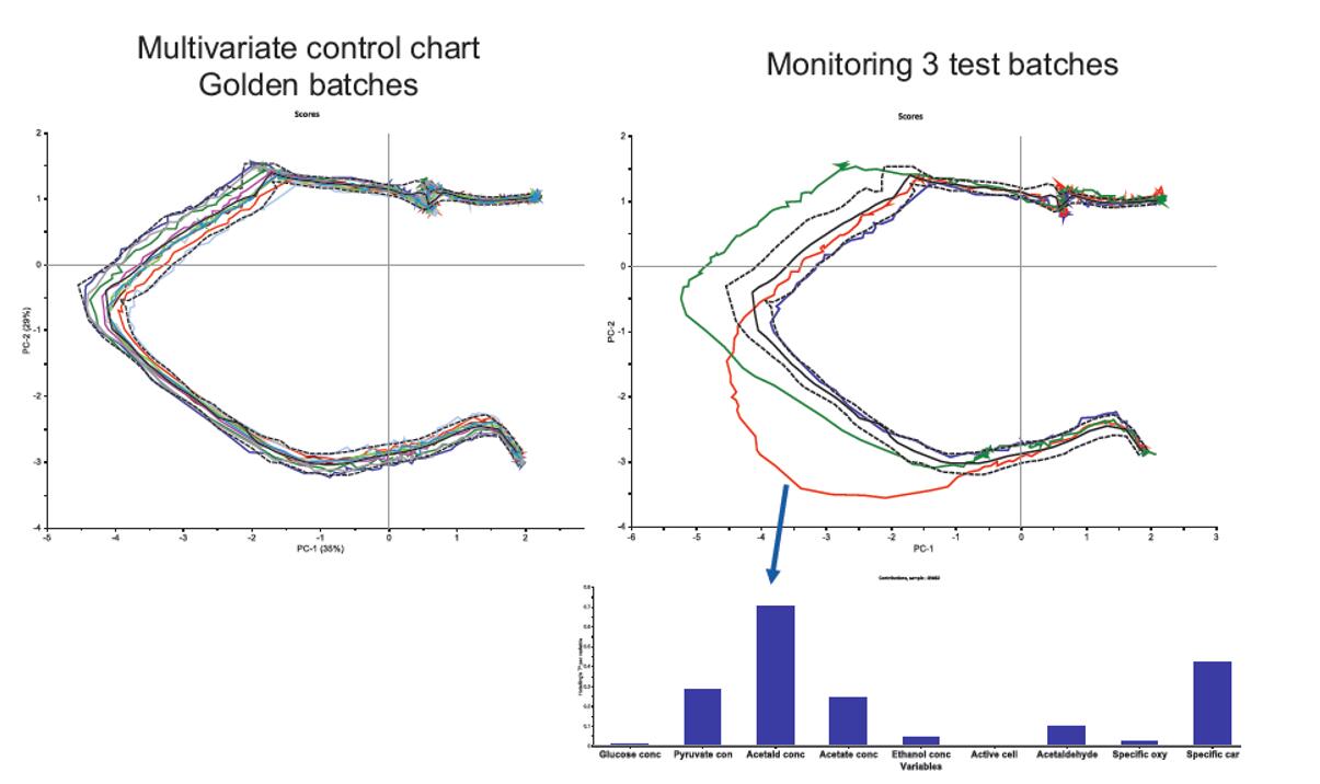 接下来,通过对10批数据的分析,一个初始模型产生,一个多变量数据控制图就展示出来了。另外,3个用于检测的测试批次被用来观察通过使用这个模型,是否可以检测出任何偏差的存在。从测试中可以看出,偏差是很容易被观察到的。
