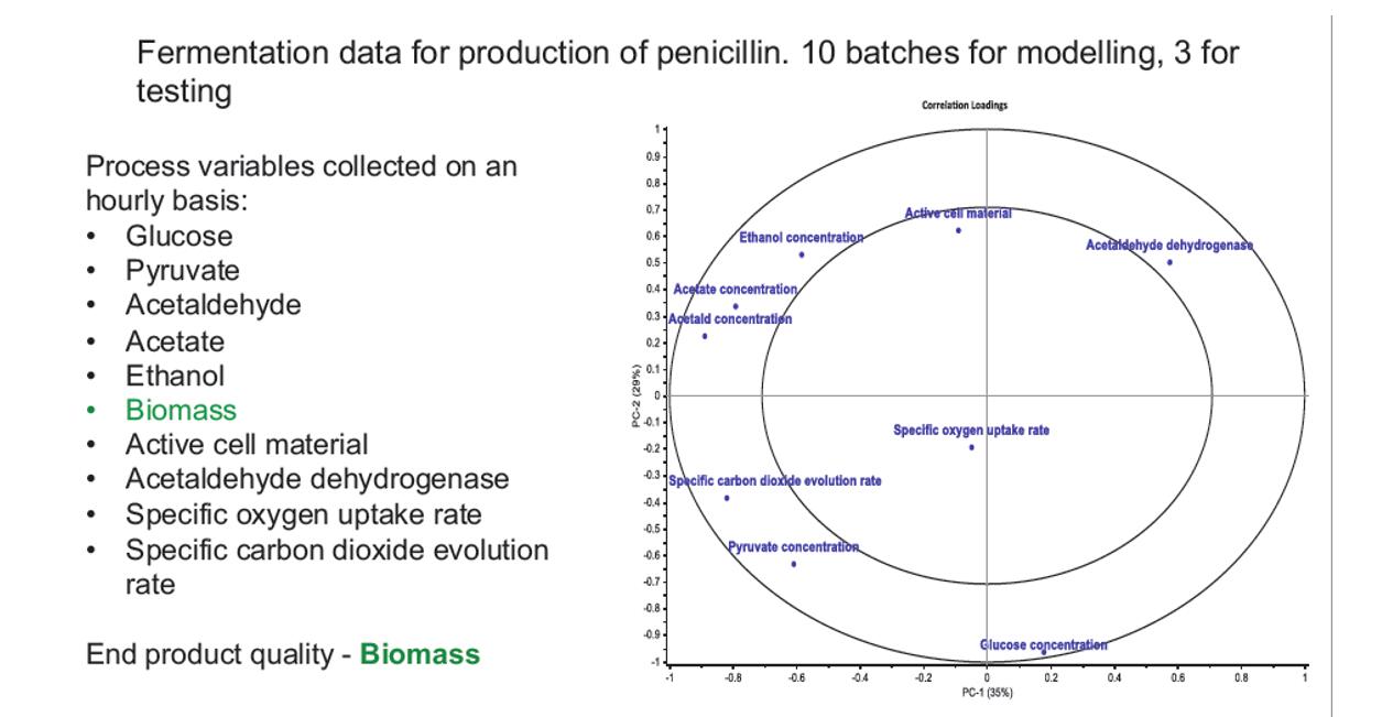 在这个案例中我们可以看到工艺变量是非常完整的,最终产品的质量指标就是生物质。生物质是我们主要观测的数据。通过多元数据分析,数据的结构和各种相关性被清楚地展示在“Loadings Plot 载荷图”中,用来展示工艺变量之间的相关性。