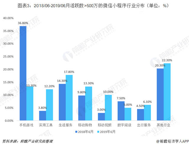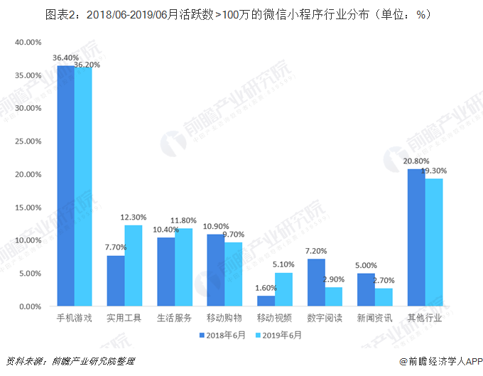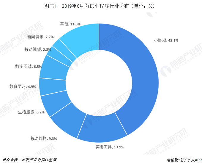 随着智能手机的不断普及和移动生活模式的逐渐渗透,方便快捷的小程序功能应用逐渐走入了人们的生活之中并迅速的俘获了大量用户。微信小程序由于具有先发优势以及所依托的微信APP具有庞大的用户基础,其用户数量增长迅速,2019年6月已经累计至7亿人次。在全部微信小程序中,小游戏占据了绝大比重,生活服务类小程序所占比重并不高,仅为6.2%,在所有行业中排在第四位。